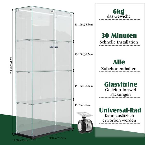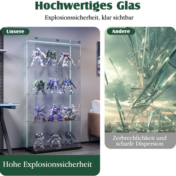Transparentes Panorama-Design: Das 360-Grad-Panorama-Design bietet eine ungehinderte Sicht, sodass Ihre Sammlerstücke aus jedem Winkel perfekt präsentiert werden können. Die Glasoberfläche ist leicht zu reinigen, einfach abwischen und sie wird wieder glänzend wie neu.