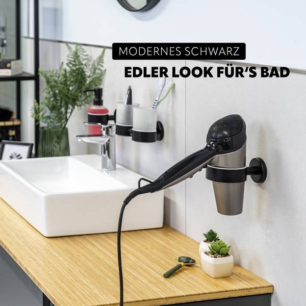 Der runde Föhnhalter besteht aus hochwertigem, rostfreiem Edelstahl in mattem Schwarz. Dieses Material sorgt nicht nur für eine ansprechende Optik, sondern garantiert auch eine hohe Widerstandsfähigkeit und Langlebigkeit. Zusätzlich schaffen Sie mehr Platz auf der Ablage und außerdem für mehr Sicherheit, indem Sie Ihren warmen Föhn geschützt einhängen. Ihr Bad bleibt übersichtlich, und gleichzeitig haben Sie alles schnell zur Hand.