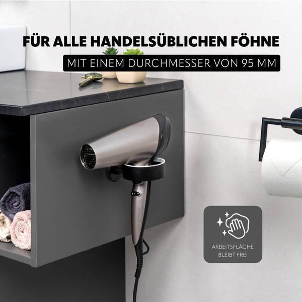 Der Haartrockner ist ideal für handelsübliche Föhne mit einem Durchmesser von bis zu 95 mm und eignet sich sowohl für kleinere als auch größere Modelle, was ihn besonders vielseitig macht. Zudem ist der Halter mit einem Schutzring ausgestattet, der dafür sorgt, dass Ihr Fön immer sicher und schonend aufbewahrt wird, ohne Kratzer oder Beschädigungen.