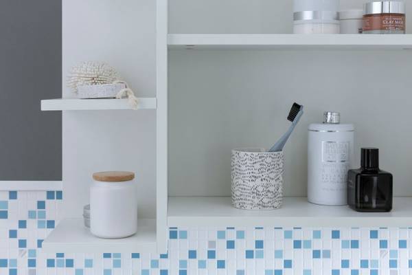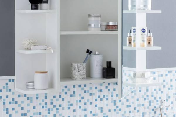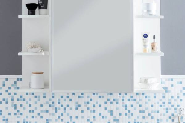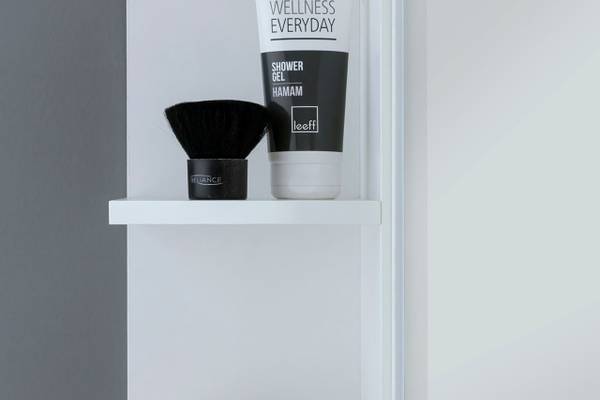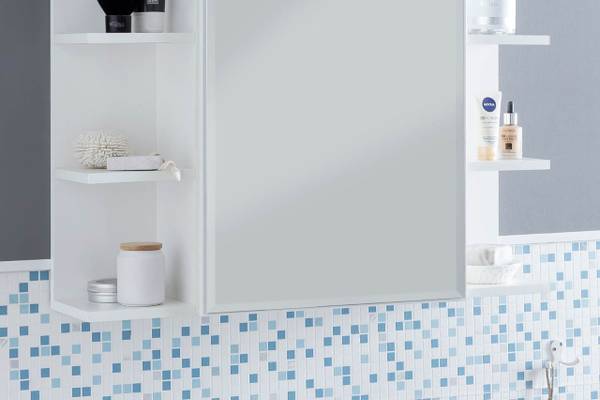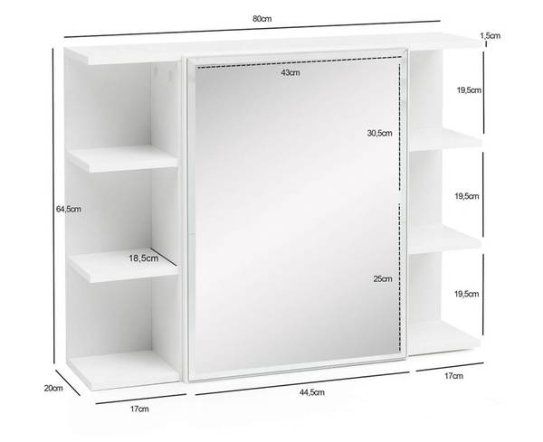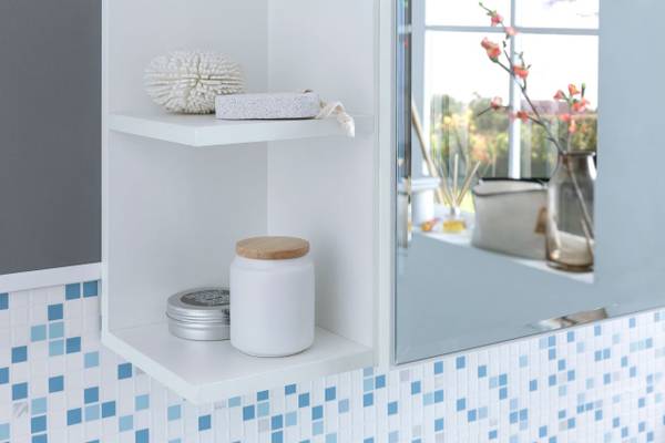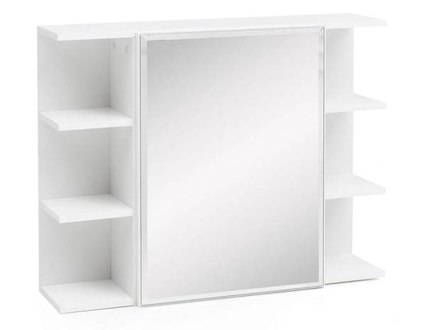 - Sechs offene Fächer und zwei praktische Türfächer hinter dem Spiegel