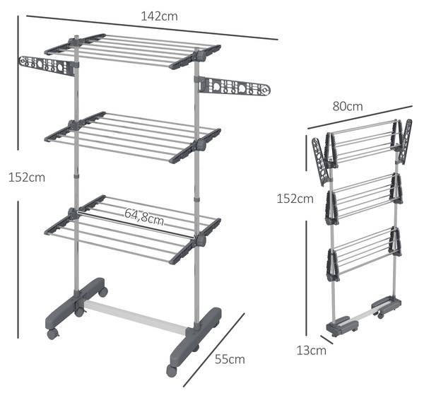 - Stabiles Material: Der Wäscheständer besteht aus robustem Stahl, was ihn langlebig und belastbar macht.