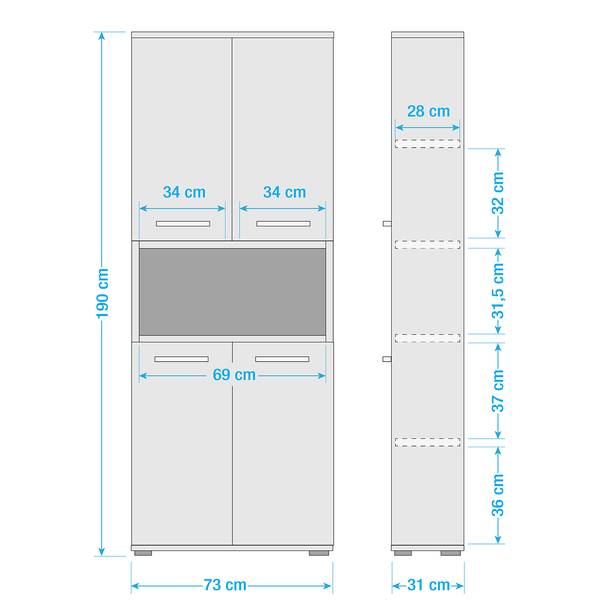 Kund:innen schätzen das moderne Design und den großzügigen Stauraum dieses Hochschranks. Die Montage wird als einfach empfunden, und das Preis-Leistungs-Verhältnis wird gelobt. Einige bemerken jedoch Probleme mit der Verarbeitung und den Griffen, während andere die Stabilität der Einlegeböden und die Standfüße bemängeln.