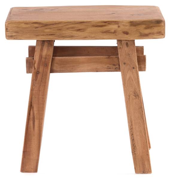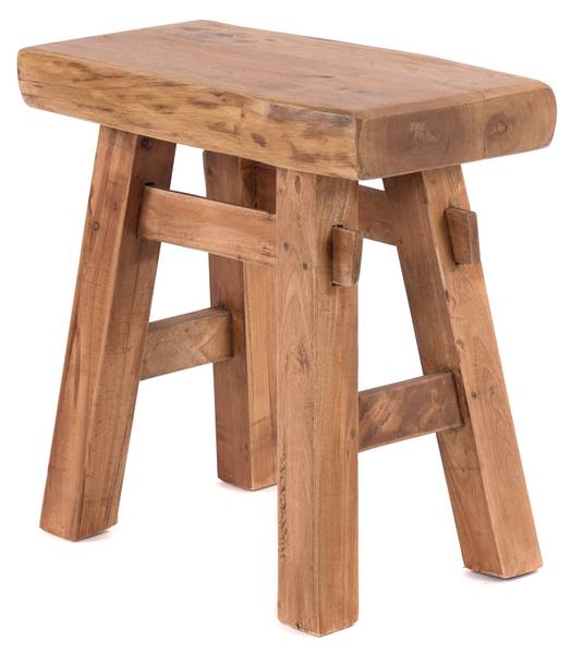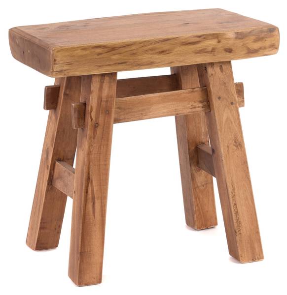 - Material: gemischtes Hartholz (recycelt), Risse und Unebenheiten unterstreichen den Charakter des Hockers
