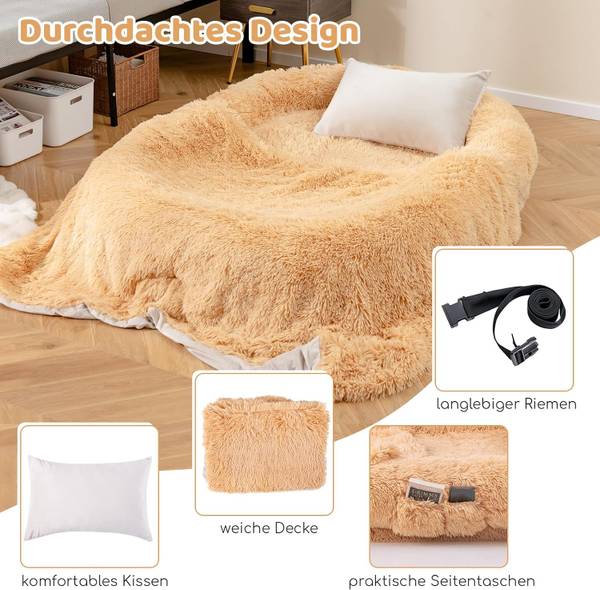 Das kuschelige Bett für Menschen und Hunde wird mit einer weichen Decke und einem bequemen Kissen geliefert, die zusätzliche Wärme und Komfort bieten, sowie mit praktischen Seitentaschen, in denen Sie wichtige Dinge griffbereit haben.