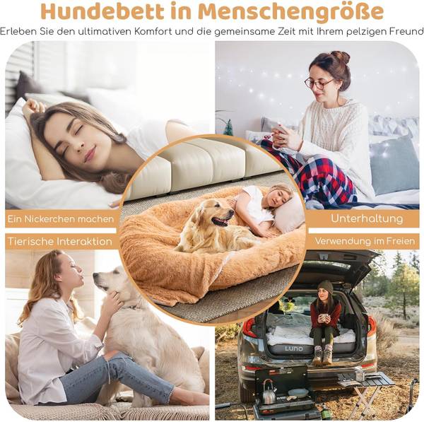 Unser großes Hunde- und Menschenbett bietet damit eine geräumige Fläche, auf der sowohl Sie als auch Ihr geliebter Vierbeiner Platz finden. Ob für ein Nickerchen, zum Spielen, für gemeinsame Unternehmungen oder sogar zum Entspannen im Freien - dieses Bett bietet den perfekten Ort für all Ihre gemeinsamen Aktivitäten. Es verfügt über einen fortschrittlichen, wabenförmigen orthopädischen Schaumstoff, der sich an den Körper Ihres Hundes anpasst, um Druckstellen zu entlasten und einen erholsamen Schlaf zu fördern. Und mit dem abnehmbaren und maschinenwaschbaren Bettbezug können Sie ganz einfach eine saubere und hygienische Umgebung für Ihre pelzigen Freunde aufrechterhalten.