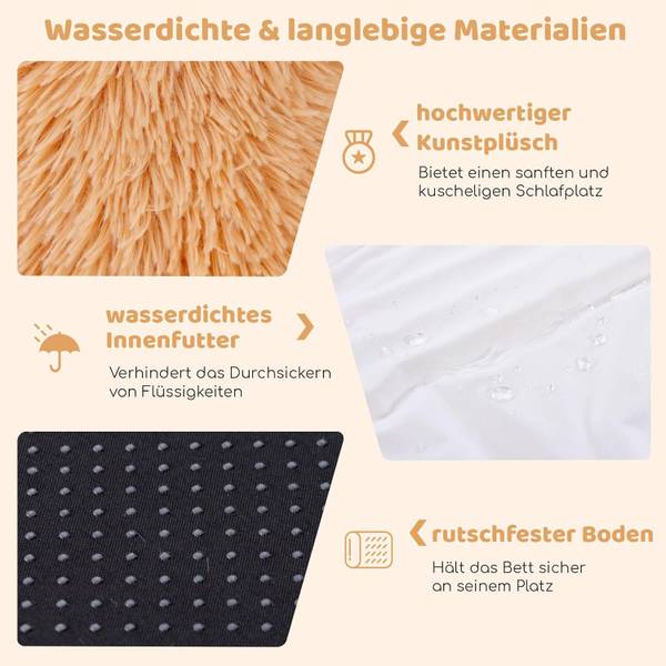 Das orthopädische Hundebett ist mit einem hochwertigen Kunstpelzbezug ausgestattet, der einen weichen und bequemen Schlafbereich bietet, während das Innere mit einem wasserdichten Innenfutter versehen ist, das das Eindringen von Flüssigkeiten verhindern kann.