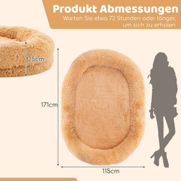 Das Bett für Menschen und Hunde misst 171 x 115 x 25 cm (L x B x H) und bietet eine große Liegefläche für das ultimative Komforterlebnis und Momente der Verbundenheit mit Ihrem vierbeinigen Freund. Es ist perfekt für ein Nickerchen, Unterhaltung, Interaktion mit den Haustieren oder sogar eine Verwendung im Freien.