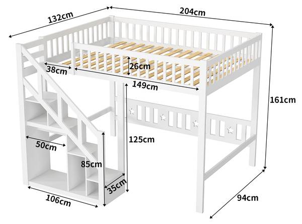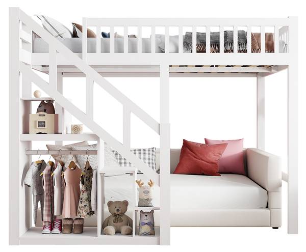 3. Platzfreundliches Design: Durch den eingebauten Stauraum wird der Raum optimal genutzt. Sehr geeignet für kleine Räume oder öffentliche Räume, bietet dieses Bett genügend Platz für ein Sofa oder Schreibtisch unter dem Bett. Daher kann es die Befriedigung der Bedürfnisse von Kindern maximieren, ob als sicherer Hafen für Kinder oder als modischer Hafen für Jugendliche.