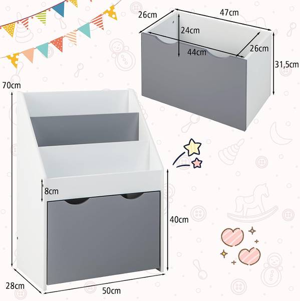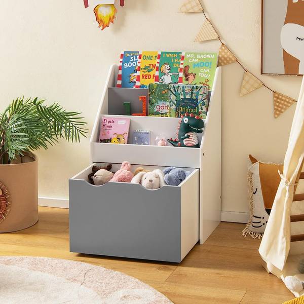 Dieses Kinderregal ist eine ideale Lösung für Kinderspielzeug und Bücher. Mit einem dreistufigen Bücherregal und einer Spielzeugkiste an der Unterseite können Kinder eine gute Angewohnheit entwickeln, ihre Gegenstände zu sortieren. Dank der angemessenen Höhe von 70 cm können Kleinkinder bequem nach ihren Büchern greifen. Darüber hinaus ermöglichen 4 leichtgängige Räder den Kindern, die Spielzeugtruhe herauszuziehen, um zu bekommen, was sie brauchen. Um die Stabilität zu erhöhen, haben wir ihn mit einer verbreiterten Basis und einer Kippsicherung ausgestattet. Zudem garantieren die abgerundeten Ecken mehr Sicherheit.
