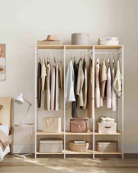- Aus einem robusten Metallrahmen und dicken Spanplatten gefertigt und durch X-Streben auf der Rückseite verstärkt, kann dieser Kleiderständer problemlos bis zu 146 kg tragen