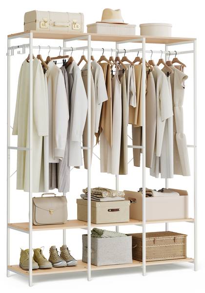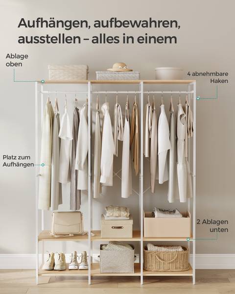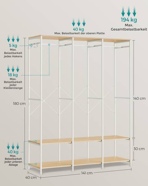 - Die maximale statische Belastbarkeit des Kleiderständers beträgt 194 kg. Bitte überschreiten Sie dieses Maximalgewicht nicht.