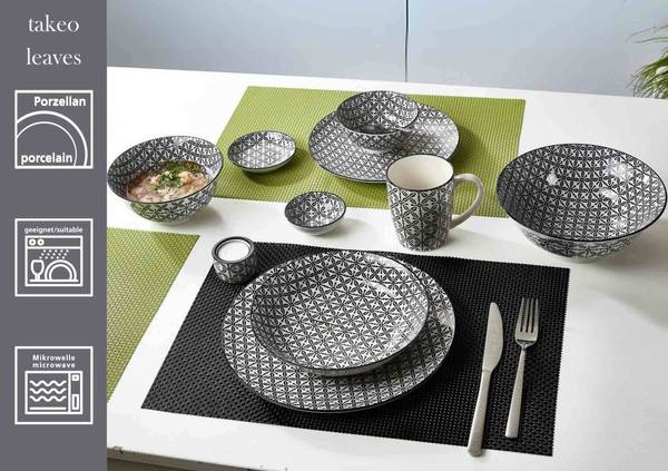 "Takeo“ ermöglicht ein stylishes Mix & Match aus typischen asiatischen Reisschalen-Dekoren. Anders als ihre traditionellen Vorbilder präsentieren sich die „Takeo“-Muster jedoch ausschließlich in Schwarz, der Lieblingsfarbe von Puristen und Minimalisten, was dem Geschirr einen skandinavisch-schlichten Touch verleiht. Der besondere Reiz liegt darin, dass die Dekore bei allen Geschirrteilen vollflächig und bei einigen Geschirrteilen sowohl außen als auch innen aufgebracht sind, damit die schönen Ornamente richtig zur Geltung kommen.