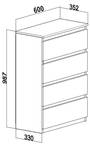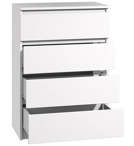 Dank des grifflosen Designs präsentiert sich die Kommode Bella4 modern und minimalistisch. Sie fügt sich perfekt in jeden Raum ein und verleiht ihm eine stilvolle Note. Die reibungslosen Schubladenauszüge basieren auf strapazierfähigen Rollenführungen und ermöglichen ein leichtes Öffnen und Schließen der Schubladen. Bei Bedarf können die Schubladen problemlos herausgenommen werden, ohne dass eine Demontage erforderlich ist.