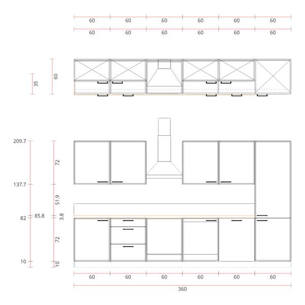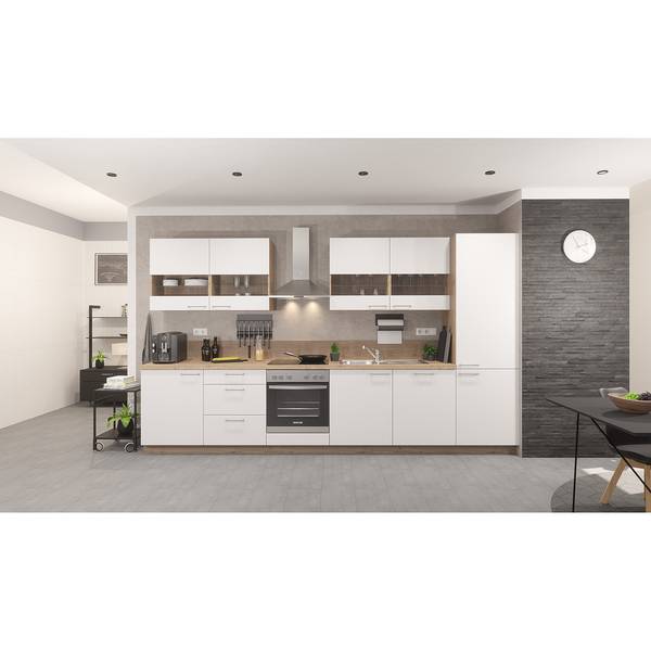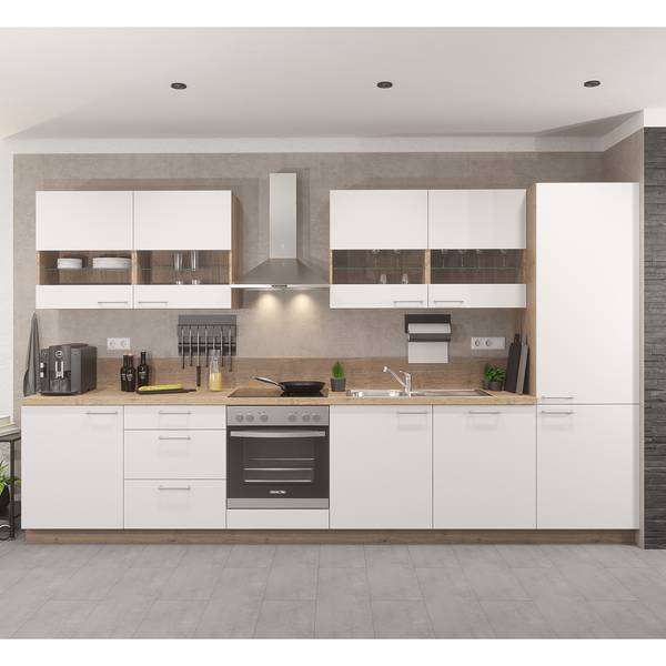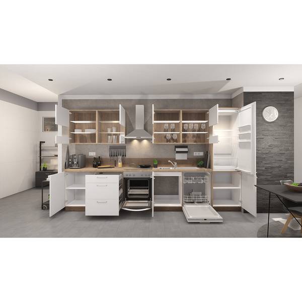 - Lieferumfang: 1 Hochschrank Geräte-Umbau Kühlautomat mit Nischenhöhe 1230mm, 1 Türfront für vollintegrierte Geschirrspüler, 1 Spülenunterschrank, 1 Herdumbauschrank mit Nischenhöhe 598mm, 2 Unterschränke, 4 Wandschränke