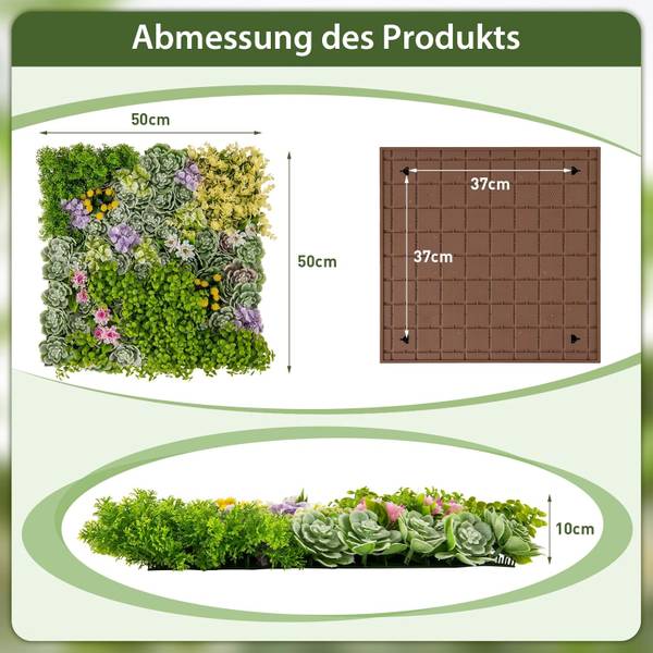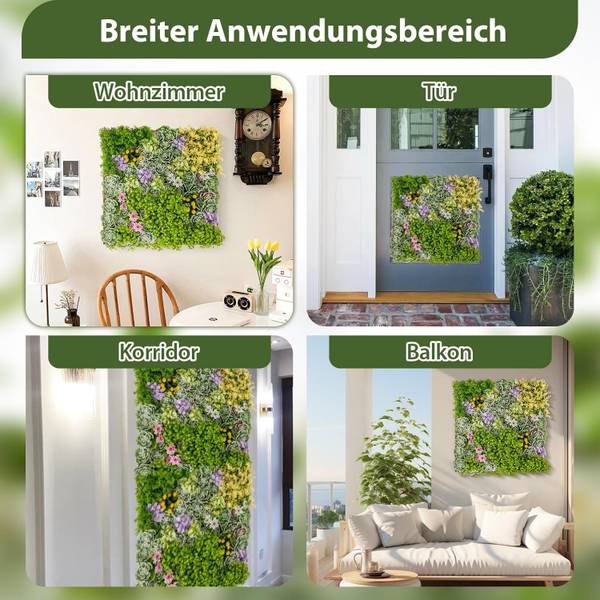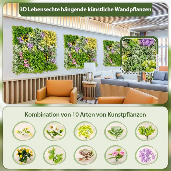 In Kombination mit 10 Arten von Kunstpflanzen, darunter lebendige Sukkulenten, bunte Blumen und Blätter mit Farbverlauf, erzeugen die hängenden Wandverkleidungen ein lebendiges und attraktives Erscheinungsbild. Die dichte Anordnung sorgt dafür, dass jedes Stück natürlich üppig aussieht.