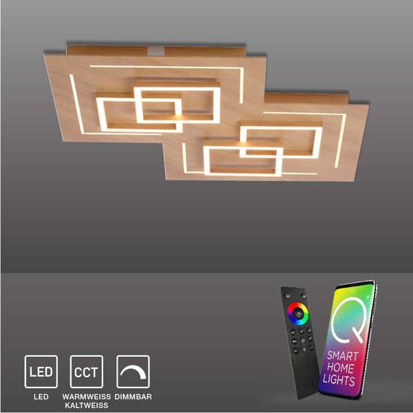 Die LED Deckenleuchte aus der Serie Q-LINEA überzeugt mit Ihrer Vielseitigkeit und der intelligenten Q®-Lichtsteuerung. Die Lampe wird aus Aluminium gefertigte, und mit inklusive vier festverbauten 10,0 Watt LED-Leuchtmitteln und vier festverbauten 2,50 Watt LED-Leuchtmitteln geliefert. Die Leuchtmittel kommen zusammen auf ein gemessenen Gesamtlumenwert von 2500 Lumen und Sie haben die Möglichkeit, die Leuchte in ihrer Lichtfarbe von warmweiß (2.700 Kelvin) bis kaltweiß (5.000 Kelvin) zu verändern. Diese Regulierung erfolgt über die Q®-Fernbedienung, die bei jeder Q®-Leuchte im Lieferumfang enthalten ist. Mit Dieser sich einzelne Leuchten sowie Leuchtengruppen (bis zu 20 einzelne Leuchten bzw. Q®-Bulbs zu max. 3 Gruppen) bedienen, in Helligkeit und Farbe verändern und abspeichern. Schaffen Sie sich Ihre ganz persönliche Wohlfühlatmosphäre. Alle Q®-Leuchten können außerdem in vorhandene Smart Home Systeme integriert werden, die auf dem ZigBee-Funkstandard basieren. Die LED-Deckenleuchte aus der Serie Q-LINEA überzeugt mit Ihrer Vielseitigkeit und der intelligenten Q®-Lichtsteuerung. Die Lampe wird aus Aluminium gefertigte, und mit inklusive zwei festverbauten 10,0 Watt LED-Leuchtmitteln und zwei festverbauten 3,0 Watt LED-Leuchtmitteln geliefert. Die Leuchtmittel kommen zusammen auf ein gemessenen Gesamtlumenwert von 1500 Lumen und Sie haben die Möglichkeit, die Leuchte in ihrer Lichtfarbe von warmweiß (2.700 Kelvin) bis kaltweiß (5.000 Kelvin) zu verändern. Diese Regulierung erfolgt über die Q®-Fernbedienung, die bei jeder Q®-Leuchte im Lieferumfang enthalten ist. Mit Dieser sich einzelne Leuchten sowie Leuchtengruppen (bis zu 20 einzelne Leuchten bzw. Q®-Bulbs zu max. 3 Gruppen) bedienen, in Helligkeit und Farbe verändern und abspeichern. Schaffen Sie sich Ihre ganz persönliche Wohlfühlatmosphäre. Alle Q®-Leuchten können außerdem in vorhandene Smart Home Systeme integriert werden, die auf dem ZigBee-Funkstandard basieren. Die smarten Lautsprecher Echo Plus* sowie Echo Show (2. Gen)* haben bereits einen integrierten Zigbee-Hub und können direkt mit unseren Q®-Leuchten kommunizieren. Für Echo Dot*, Echo*, Echo Spot*, Echo Show (1. Gen.)*, Google Home** und Google Home mini** wird hingegen ein zusätzliches Gateway benötigt. Mit der Anbindung an ein ZigBee-kompatibles Gateway eines Drittanbieters (z.B. homee etc.) können die Leuchten per Smartphone, Tablet oder PC ganz bequem über eine dazugehörige App gesteuert werden. In Kombination mit den Sprachassistenten Alexa* oder Google Home** ist das Bedienen der Leuchten mit einer Sprachsteuerung möglich, sodass Sätze wie "Alexa, schalte das Licht an" schon bald für Sie eine Selbstverständlichkeit darstellen und Ihren Komfort sowie Ihre Sicherheit in Ihrem Eigenheim erhöhen. *Amazon, Echo Plus und Alexa sind Marken der Amazon Europe S.a r.l und dienen lediglich als Hinweis auf die Kompatibilität und Nutzungsmöglichkeiten unserer Smart-Home Q-Leuchten. Die dargestellten Produkte und Leuchten stammen nicht von Amazon. **Google Home ist eine Marke von Google und dient lediglich als Hinweis auf die Kompatibilität und Nutzungsmöglichkeiten unserer Smart-Home-Q-Leuchten.
