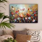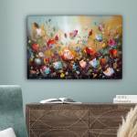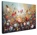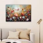 Ein farbenfrohes Ölgemälde mit vielen Blumen.