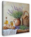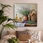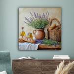 Lavendelblüten in einem Topf mit Brot, Honig und Olivenöl. Ein friedliches und duftendes Stillleben.