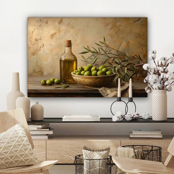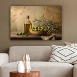 Eine Schale mit Oliven und eine Flasche Olivenöl, mit einem Olivenzweig im Hintergrund. Ein einfaches und mediterranes Bild.