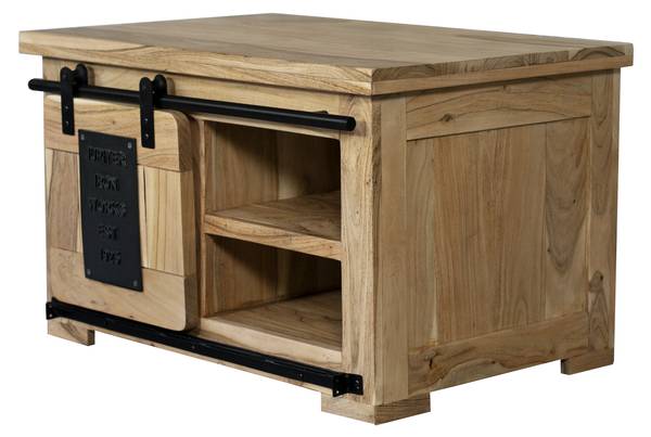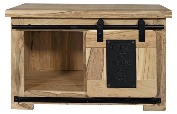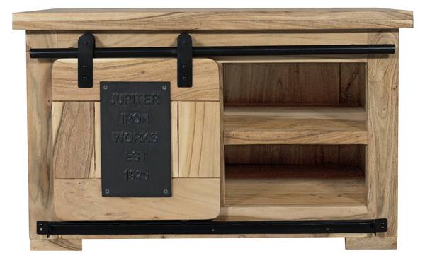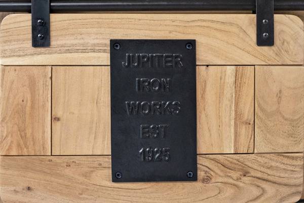 Stilgerechte Metallelemente – Der Truhenschrank zeigt sich mit verschiedenen Metallelemente. Mit der angebrachten Eisen-Reling und den Metallrollen kann die Schiebetür von rechts nach links geschoben werden. Auch an der Tür befindet sich eine stilvolle Applikation aus Gusseisen. Der Schrank harmoniert bestens mit anderen Wohnmöbeln aus den Stilrichtungen Industrial, Modern oder Rustikal.