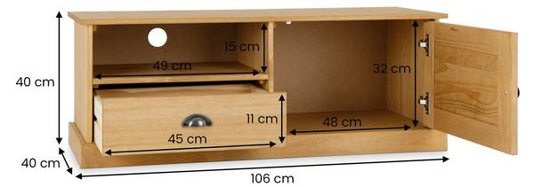 Das TV-Lowboard VENETA bietet die perfekte Kombination aus Funktionalität und zeitlosem Design. Gefertigt aus massivem Kiefernholz, bietet es nicht nur praktischen Stauraum, sondern verleiht deinem Wohnzimmer auch eine gemütliche Atmosphäre. Mit einer Schublade und zwei Fächern mit Einlegeböden hast du genügend Platz für Fernsehgeräte und weiteres Zubehör. Die eleganten Muschelgriffe aus Metall setzen besondere Akzente, während die Kabelöffnung auf der Rückseite für Ordnung sorgt. Ein Möbelstück, das sich in jedes Wohnzimmer perfekt integriert und gleichzeitig für mehr Organisation sorgt.