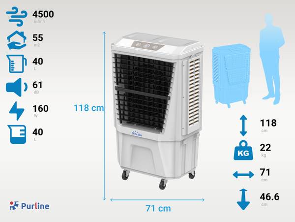 Der RAFY 150 verfügt über ein digitales Bedienfeld mit drei Geschwindigkeitsstufen, einen Zeitschalter (7,5 Std.) und eine automatische Oszillation, um die Luftverteilung zu verbessern und ein ganz persönliches Erlebnis zu bieten, sowie über eine Doppelfunktion zur Luftbefeuchtung und Luftreinigung dank des Gebläses, und das alles bei einem maximalen Verbrauch von 150 W, was zehnmal weniger ist als bei anderen tragbaren Klimageräten. Zu den Extras gehört die Möglichkeit der Fernsteuerung über eine Fernbedienung. Mit seinem kompakten Design in Weiß, seinen Maßen (LxTxH: 36 x 33 x 100 cm) und seinem Gewicht (13,5 kg) ist er ideal für große Räume, und dank seiner Räder können Sie ihn je nach Bedarf verschieben.