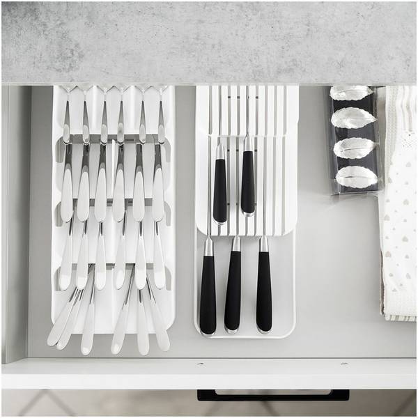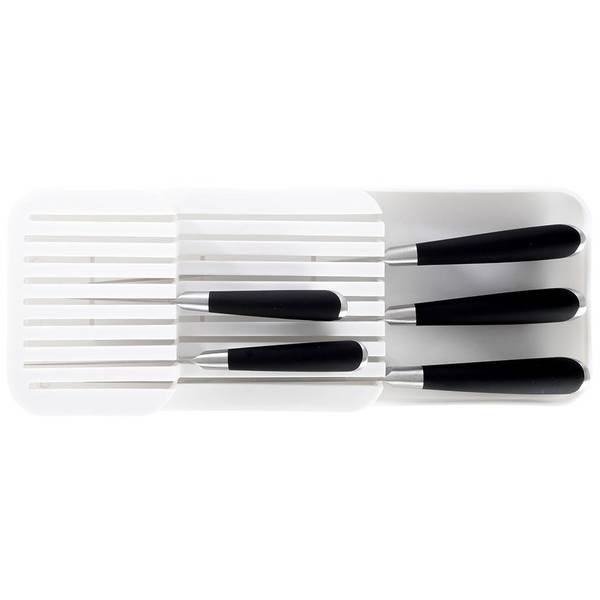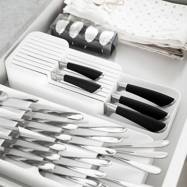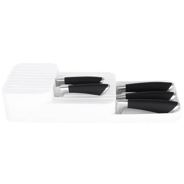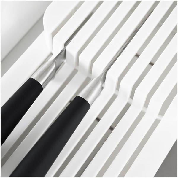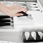 Praktischer Messer-Organizer, in dem die Messer auf zwei Ebenen aufbewahrt werden können. Er hat eine passende Konstruktion, sodass er wenig Platz einnimmt. Dank ihm werden die Messer ordentlich im Schrank aufbewahrt und das klassische Design sorgt dafür, dass er in jede Schublade passt. Originalprodukt der Marke Vilde. Hergestellt nach europäischen Standards.