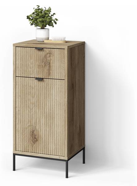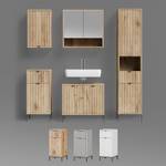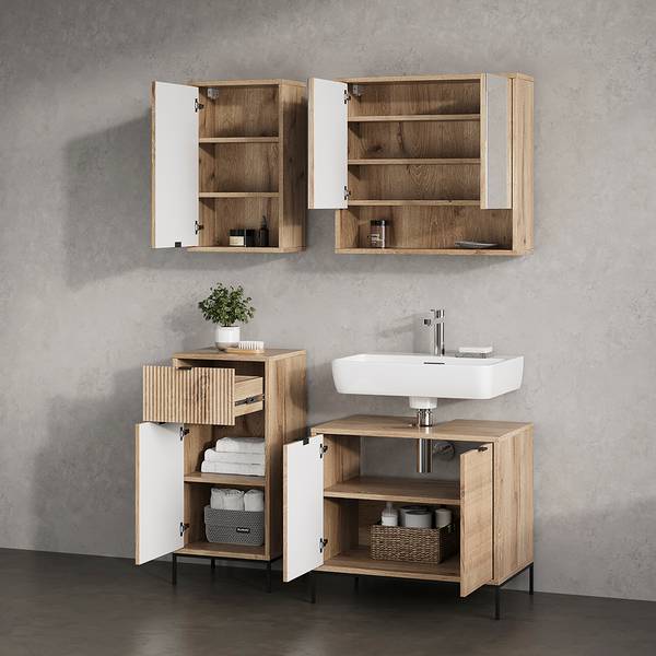 MATERIAL: Der Badezimmerschrank hat einen Korpus aus 18-mm-Spanplatte und Fronten aus 16-mm-MDF mit Metallgriff. Die 12 cm hohen Metallfüße sorgen für Stabilität.