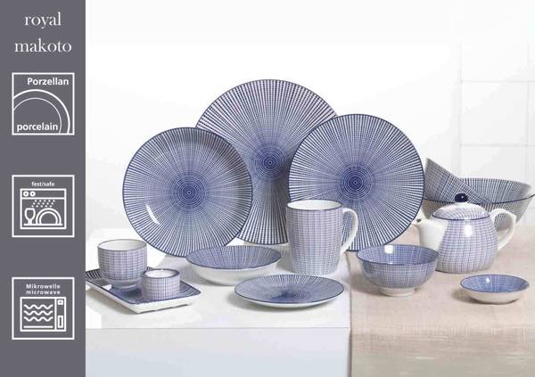 Blaues Kombiwunder: Die Dessins „Makoto“, „Reiko“ und „Sakura“ erobern als zeitgemäß stylishe Adaption traditioneller japanischer Reisschalen-Dekore die Herzen trendbewusster Kosmopoliten. Da Dessins einst nur von Hand gemalt und daher nicht auf jeder Schale perfekt kopiert werden konnten, wurden sie von Schale zu Schale extra unterschiedlich gestaltet. Auch wenn jedes Dessin seinen eigenen Charakter hat, sind „Makoto“, „Reiko“ und „Sakura“ dank des royalblauen Farbtons als Trio perfekte Teamplayer auf dem Tisch. Damit die schönen Dessins richtig zur Geltung kommen, sind sie bei allen Geschirrteilen vollflächig und bei einigen zudem außen und innen aufgebracht.