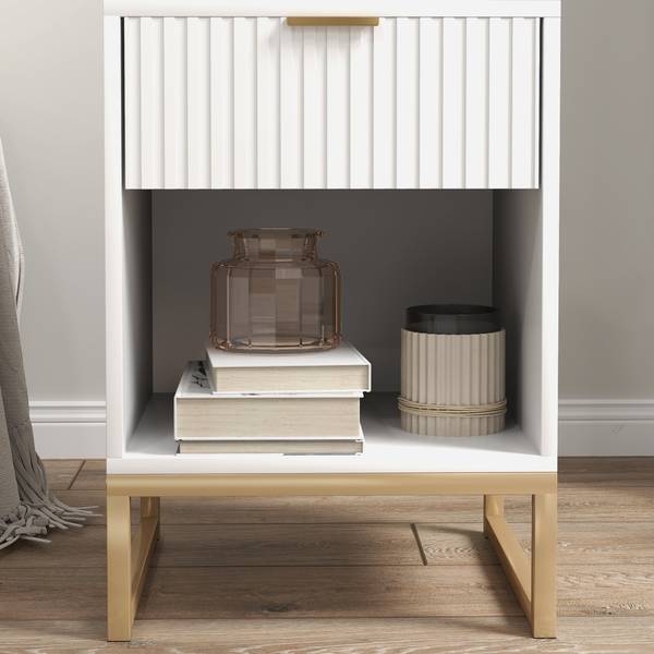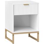 ● Modernes Design mit weißen Rillenpaneelen und goldfarbenem Metall