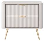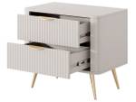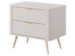 Dank seiner zwei geräumigen Schubladen bietet der Nachttisch Latina viel Platz zur Aufbewahrung verschiedener Kleinigkeiten und persönlicher Gegenstände. Metallgriffe und Beine in Gold verleihen dem Tisch Eleganz und Klasse und unterstreichen sein modernes Design. Parallele und solide Scharniere gewährleisten ein reibungsloses Öffnen und Schließen der Schubladen.