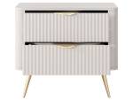 Der Nachttisch Latina wurde aus hochwertigen Materialien gefertigt, die Langlebigkeit und Beständigkeit über Jahre hinweg gewährleisten. Sein Korpus aus 16 mm dicker laminierte E05-Spanplatte, in einem zarten Beige, harmoniert perfekt mit den Fronten aus 18 mm dicker MDF-Platte. Geriffelte Fronten verleihen dem Möbelstück einen originellen Charakter, und abgerundete MDF-Leisten an den Seiten verleihen ihm ein elegantes Aussehen.