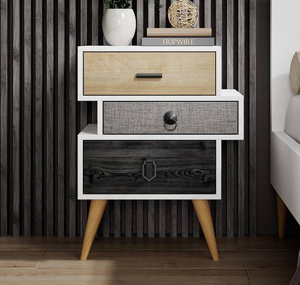 Materialien des Nachttisches:18 mm starke Spanplatten und Holzfüße.