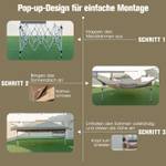 Der tragbare Pavillon mit Pop-up-Design ermöglicht eine mühelose Montage und spart so Zeit und Mühe. Und er verfügt über drei Höhenpositionen zur Auswahl. Das zweistufige Pavillondach erleichtert die Luftzirkulation zusätzlich. Unser Pavillonzelt besteht aus Oxford-Stoff und ist reißfest für eine lange Lebensdauer. Darüber hinaus ist das Gewebe beschichtet, um eine Wasserdichtigkeit von 1000 mm und einen UV-Schutzfaktor von 50+ zu gewährleisten. Da die mitgelieferte Tragetasche über zwei flexible Rollen verfügt, können Sie das Pavillonzelt problemlos zu jedem Anlass im Freien transportieren.