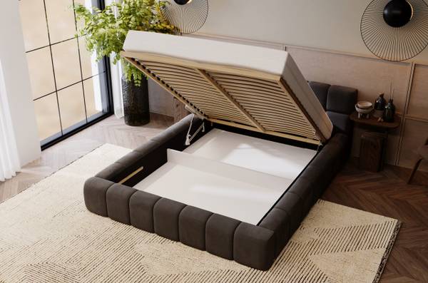 Das Bett mit Stauraum Alicante ist ein Möbelstück, das für die Gestaltung moderner Räume entwickelt wurde. Sein einzigartiges Design und seine Verarbeitung werden selbst die anspruchsvollsten Kunden begeistern. Da wir viel Zeit in unserem Schlafzimmer verbringen, ist die Auswahl der richtigen Möbel sehr wichtig. Das gepolsterte Bett Alicante ist mit einem geräumigen Bettkasten und einem soliden Holzrahmen mit Federn zum Anheben des Bettkastens ausgestattet. Dieses Modell ist in 4 Größen erhältlich, so dass es in jeden Raum passt.