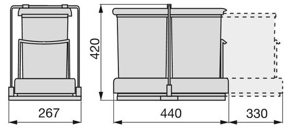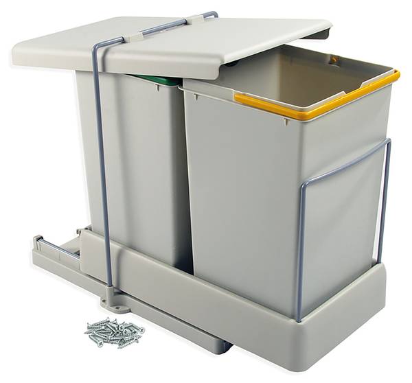 Eimer zur Entsorgung und Trennung des Haushaltsmülls, Anbringung in Küchenmöbeln. Die ausziehbare Basis dieser Mülleimer wird an der Unterseite der Module befestigt. Beim Öffnen der Tür werden sie automatisch ausgezogen und der Deckel öffnet automatisch. Dies macht sie leicht zugänglich.