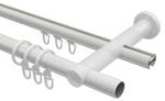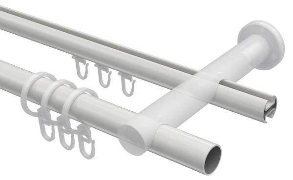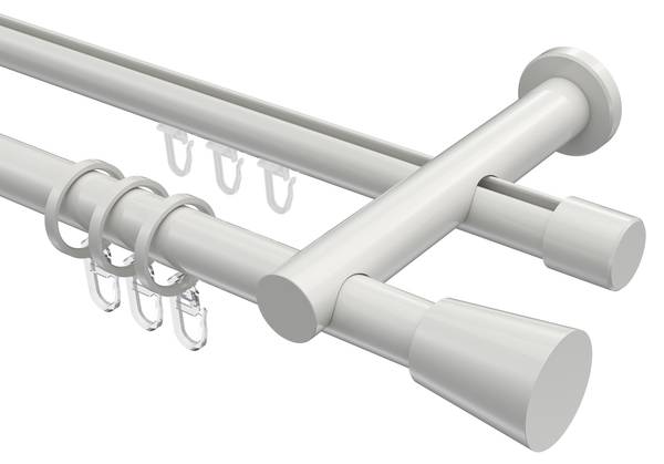 - Lieferumfang: 2 x Endstücke "Kappe" Weiß, 2 x Endstücke "Konus" Weiß, 24 x Faltengleiter mit Faltenlegehaken, 24 x Flachringe Weiß mit Faltenlegehaken, 2 x Innenlaufprofile 120 cm Weiß, 1 x Innenlaufverbinder, 2 x Rohre 120 cm Weiß, 1 x Rohrverbinder, 3 x Träger 2-läufig Weiß inkl. Befestigungsmaterial