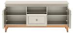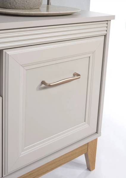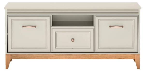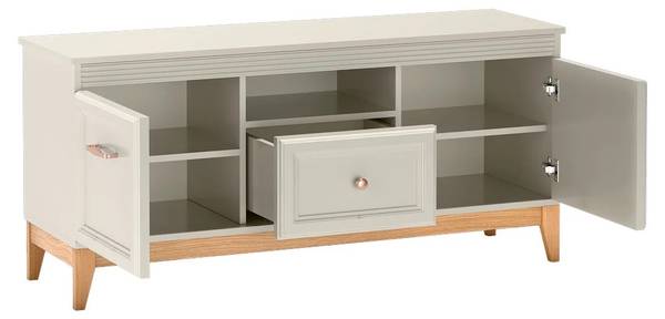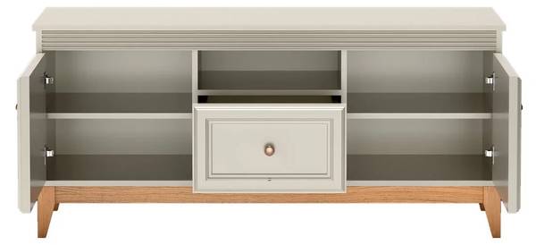 Der TV-Schrank im klassischen englischen Stil ist eine elegante und praktische Lösung für Ihr Wohnzimmer. Er verfügt über ein offenes Regal, das sich ideal für Multimedia-Geräte eignet, sowie zwei geschlossene Schränke, die zusätzlichen Platz für Zubehör bieten und für Ordnung sorgen. Das Ganze ruht auf stabilen Beinen aus Massivholz, die Langlebigkeit und Stabilität garantieren. Die Fronten mit zarten Fräsungen unterstreichen den traditionellen Charakter des Möbelstücks, während die goldenen Griffe ihm subtile Eleganz und Raffinesse verleihen.