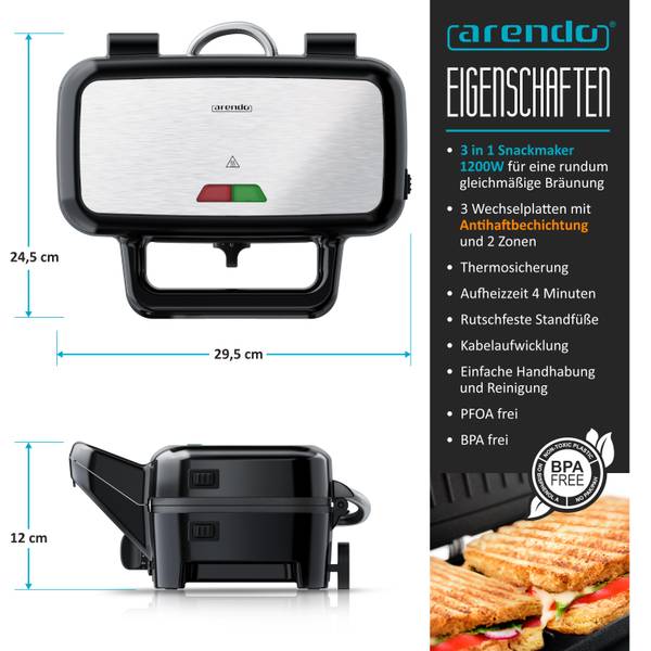 - 3 in 1 Snackmaker mit leistungsstarken 1200 W für eine rundum gleichmäßige Bräunung