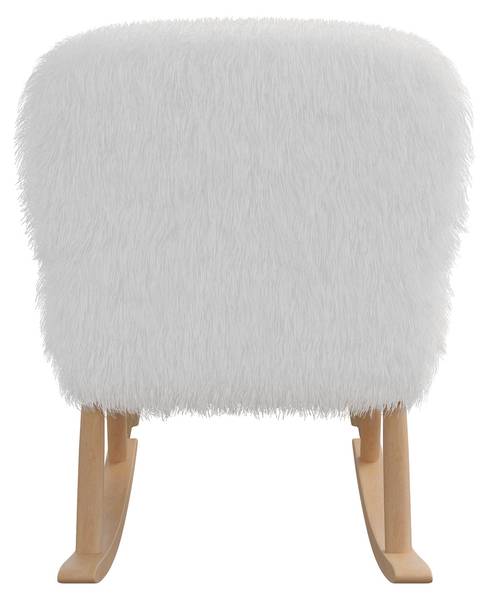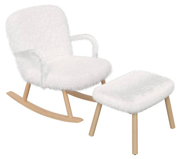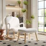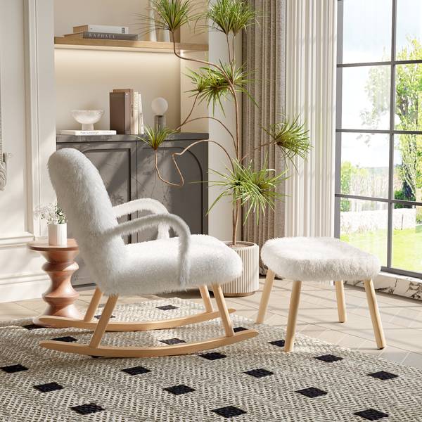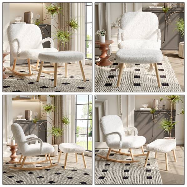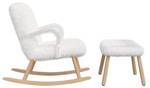 [Elegantes Design]: Der Schaukelsessel mit Fußstütze ist in einem anspruchsvollen Weiß mit Teddystoff gehalten und wird durch das natürliche Holzfinish an den geschwungenen Armlehnen und dem Rahmen ergänzt. Dieses elegante Design verleiht Ihrem Wohnraum einen Hauch von Raffinesse und Stil