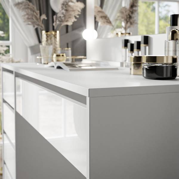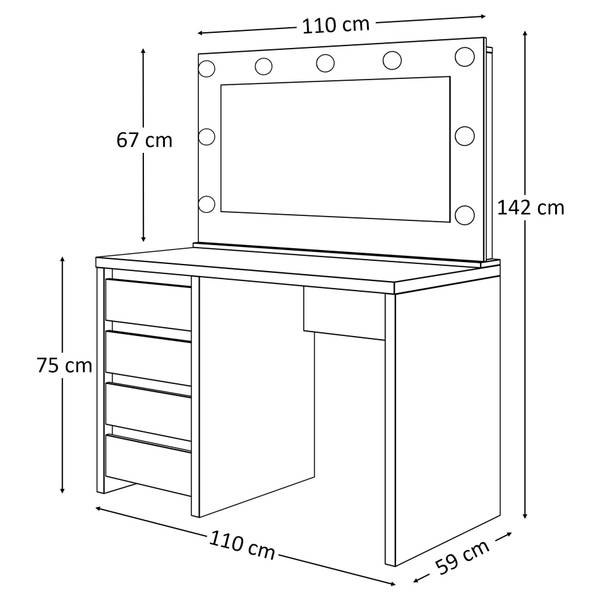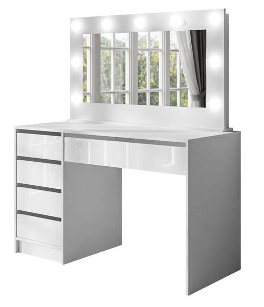 Die Möbel sind vollständig aus einer hochwertigen laminierten Platte gefertigt, die eine erhöhte Widerstandsfähigkeit gegen mechanische Beschädigungen aufweist. Diese Lösung garantiert, dass sich unser Produkt nicht nur durch sein hervorragendes Aussehen, sondern auch durch die Qualität der Verarbeitung auszeichnet. Die glatte Oberfläche zerkratzt nicht und nimmt keinen Schmutz auf, so dass sich keine schädlichen Mikroorganismen oder Schimmel darauf bilden können. Außerdem sorgt der ABS-Kantenschutz dafür, dass der Schminktisch wasserfest ist, damit das Möbelstück nicht aufquillt.