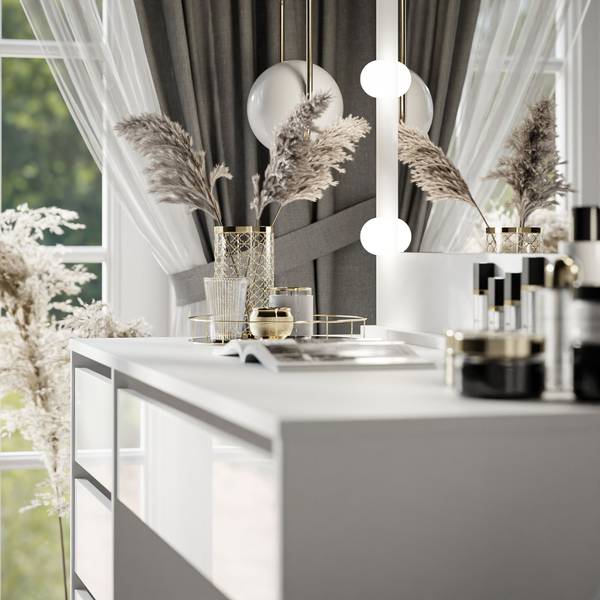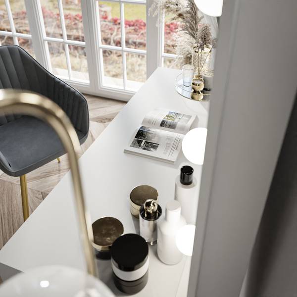 Unser Schminktisch MADA ist eine Antwort an alle, die einen Hauch von Modernität in ihre Wohnung bringen wollen. Die schneeweiße Farbe und die zarte und schlichte Form passen perfekt in zeitgenössische Arrangements und sogar in ein Jugendzimmer, wo sie den Raum optisch aufhellen und ihn gleichzeitig mit subtiler Schönheit erfüllen kann.