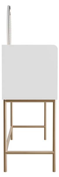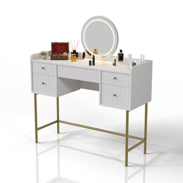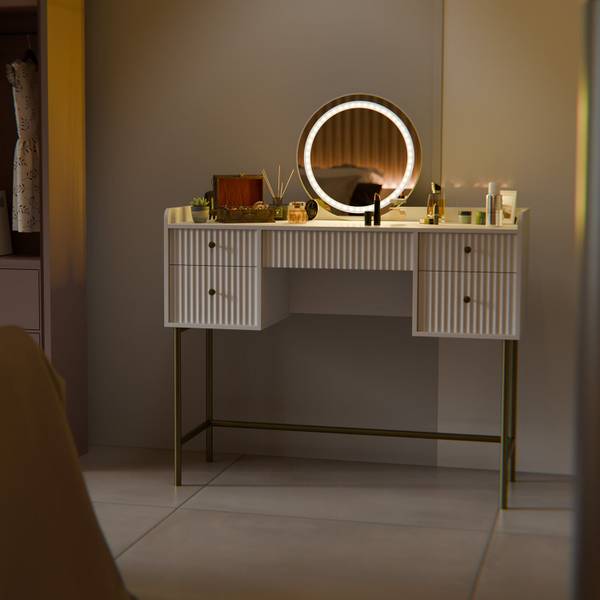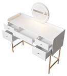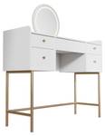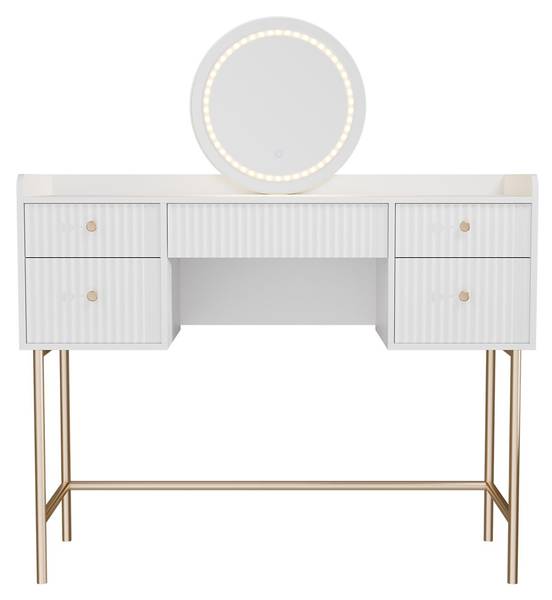 Der Schminktisch Samira in Weiß & Gold überzeugt mit luxuriösem Design und großzügigem Stauraum. Mit 5 Schubladen und einer runden Spiegeloberfläche bietet der Kosmetiktisch viel Platz für Make-up, Schmuck und Pflegeprodukte. Der Touch-LED-Spiegel sorgt für perfekte Sicht beim Schminken. Dank kompakter Maße eignet sich die Spiegelkommode ideal für Schlafzimmer oder Jugendzimmer. Aus hochwertigem MDF gefertigt, ist der Frisiertisch pflegeleicht und langlebig. Ob als Schminktisch für Teenager oder elegante Frisierkommode – Samira ist die praktische und stilvolle Lösung für jeden Tag.
