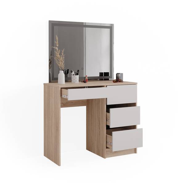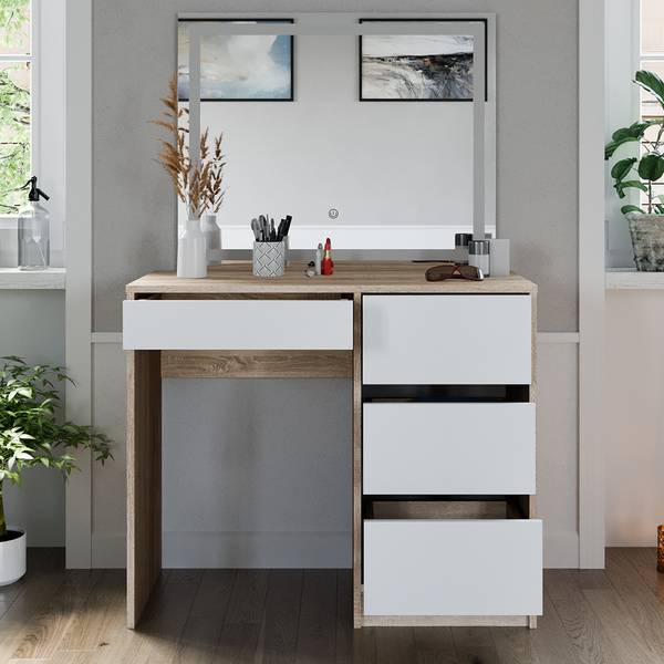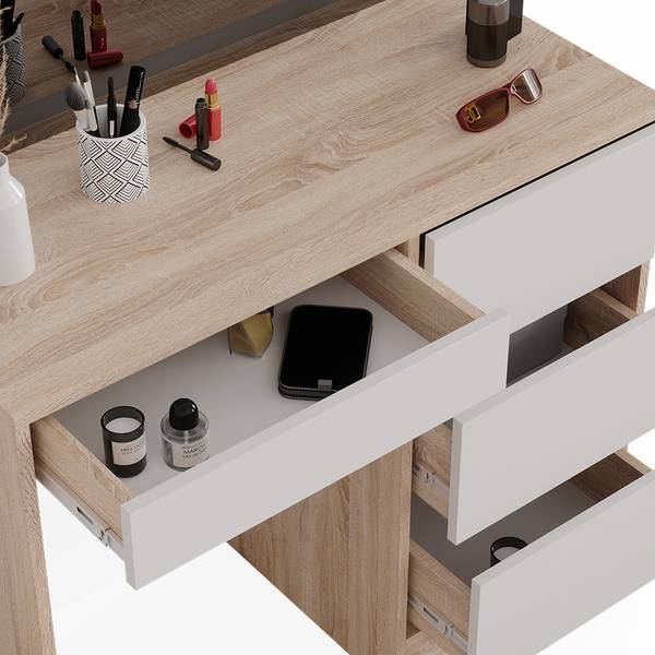 Ein LED-Spiegel ist im Schminktisch-Set enthalten, um Ihnen ein vollständiges Styling-Erlebnis zu bieten. Vielseitige Aufbewahrungsoptionen halten Ihre Kosmetik und Accessoires organisiert. Das moderne Design fügt Eleganz und Stil in Ihr Raumkonzept ein. Dank der einfachen Montage ist Ihr Schminktisch im Handumdrehen einsatzbereit.