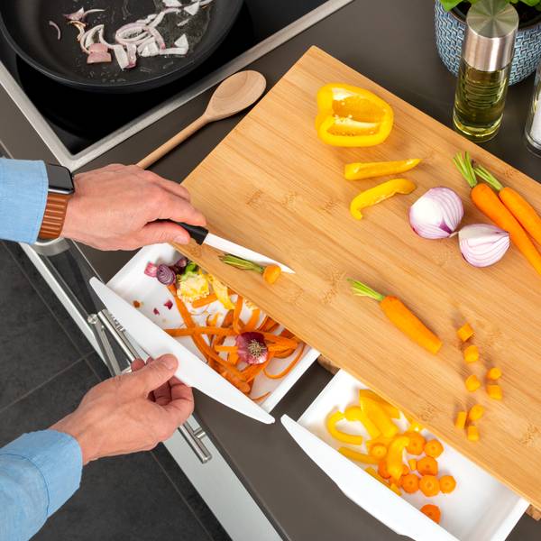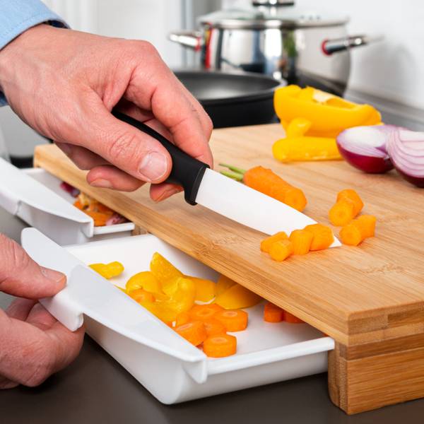 Das Schneidebrett mit 2 Auffangschalen ist praktisch und vielseitig einsetzbar. Sowohl zum Schneiden von Gemüse und Obst, als auch zum Schneiden von Fleisch geeignet. Durch die Auffangschalen werden direkt die geschnittenen Stücke und der Abfall getrennt. Zudem entfällt ein doppeltes Aufsammeln und es gibt mehr Platz auf der Schnittfläche.