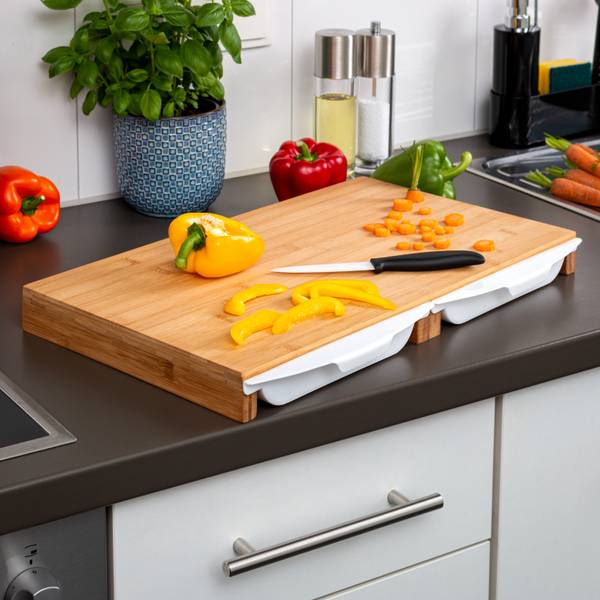 - Lieferumfang: 1x Schneidebrett, 2x Auffangschalen
