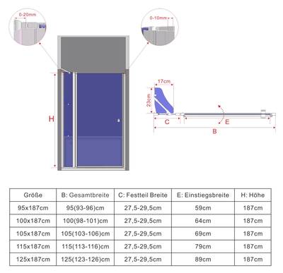 - 95x187 cm (Breite x Höhe) | Verstellbereich: 93-96 cm | Einstiegsbreite: 59 cm