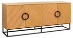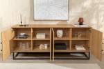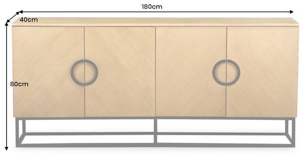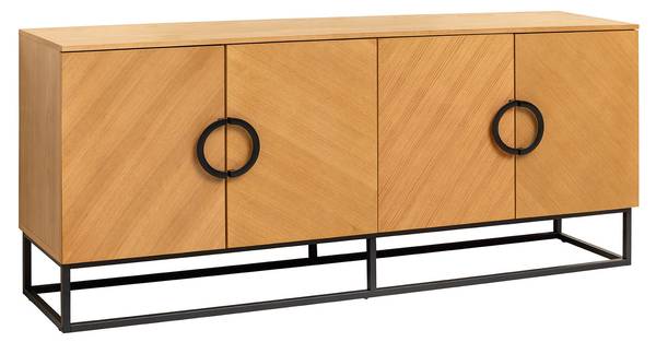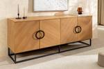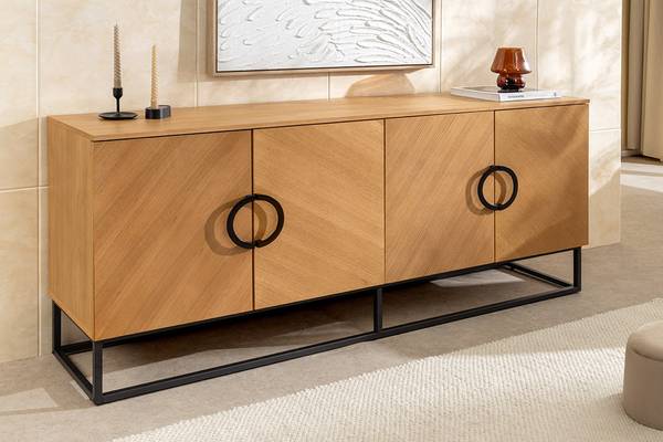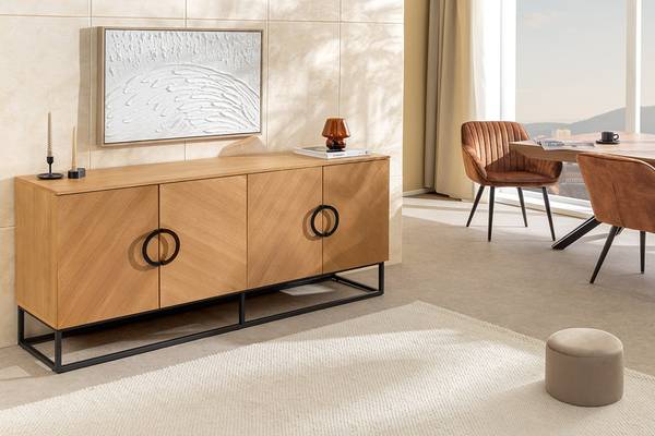 Mit dem Sideboard GRANDEZZA bringst Du ein echtes Design-Statement in Deinen Wohnraum. Die natürliche Optik des Korpus mit edlem Eichen-Echtholzfurnier verleiht dem Möbelstück eine warme, elegante Ausstrahlung. Die markanten runden Griffe und das robuste Metallgestell in Schwarz sorgen für einen modernen Kontrast und machen das Sideboard zu einem echten Hingucker.