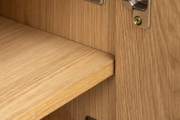 Hinter den vier grifflosen Türen verbergen sich acht praktische Fächer, die reichlich Platz für Geschirr, Bücher oder Wohnaccessoires bieten. Die Scharniertüren lassen sich leicht öffnen und schließen, während die verstellbaren Bodenschoner für einen stabilen Stand sorgen – selbst auf unebenen Böden. So bleibt Dein Wohnbereich nicht nur stilvoll, sondern auch wunderbar aufgeräumt.