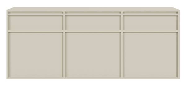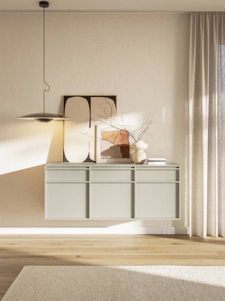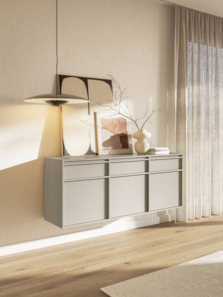 Das hängende Sideboard Evo ist eine perfekte Wahl für alle, die minimalistische Looks, aber maximale Funktionalität lieben. Dank seiner puristischen Gestaltung und der hängenden Montage erweist es sich als ausgesprochen attraktiv und verleiht dem Raum eine moderne und luftige Atmosphäre. Darüber hinaus ist es praktisch und funktional: Ideal für kleine Räume, da es den Boden freigibt und den Raum optisch vergrößert. Ein vielseitiges Möbelstück hilft Ihnen sowohl im Wohn- als auch im Schlafzimmer oder in der Küche Stauraum und Ordnung schaffen. Drei Schränke hinter den grifflosen Türen mit Push-to-Open Funktion bieten viel Platz für Kleidungsstücke, Tischwäsche, Deko und andere Gegenstände, die Sie blickdicht verstauen möchten. Drei praktische Schubladen eignen sich ideal für wichtige Unterlagen, Servietten, Kerzen und andere Kleinigkeiten. Die breite Oberplatte ist ein Pluspunkt dieses Möbelstücks, deren Nutzungsmöglichkeiten individuell und vielfältig sind: von der Präsentation von Deko-Objekten und persönlichen Gegenständen bis zur Schaffung einer stimmungsvollen Atmosphäre mit Kerzen, Duftlampen oder Windlichtern. Bei Bedarf kann die Oberplatte auch als zusätzliche Servierfläche für Speisen und Getränke genutzt werden.